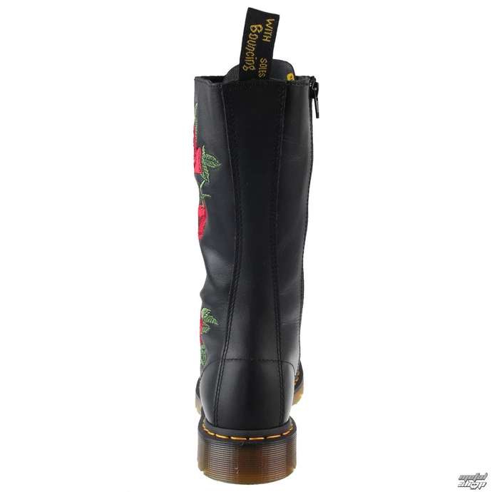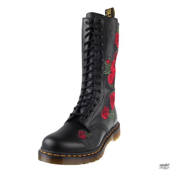 14-eye boots by Dr. MARTENS made of genuine bovine leather covered with paint and decorated with embroidery.