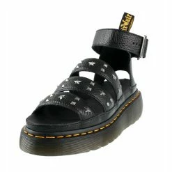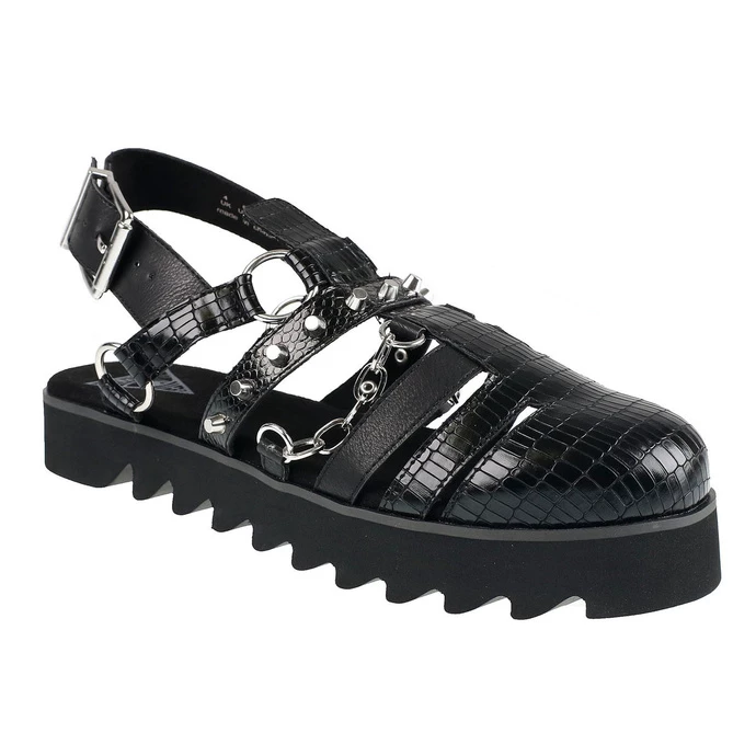 Walking sandals, by DISTURBIA. Composition: straps – synthetic leather (PU) with snake and crocodile leather pattern , lining – polyester, metal cones and other accessories, rubber sole – 100% VEGAN. Total height: 11 cm. Sole height (heel) approx .: 2.5 cm. Sole height (front) approx .: 2.5 cm. The shoes are not suitable for humid environments, do not put them into the water.
