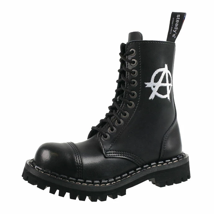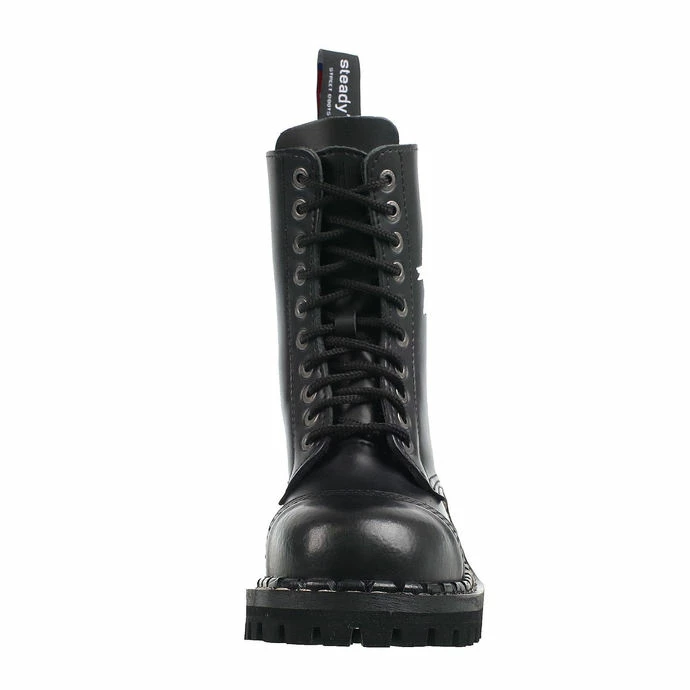 10-eye boots, by STEADY’S.Made of real leather covered with a paint in different shades.The outsole is made of high-quality rubber. Embroidery on the inner side.Slightly raised front of the shoe (tip) for higher walking comfort.