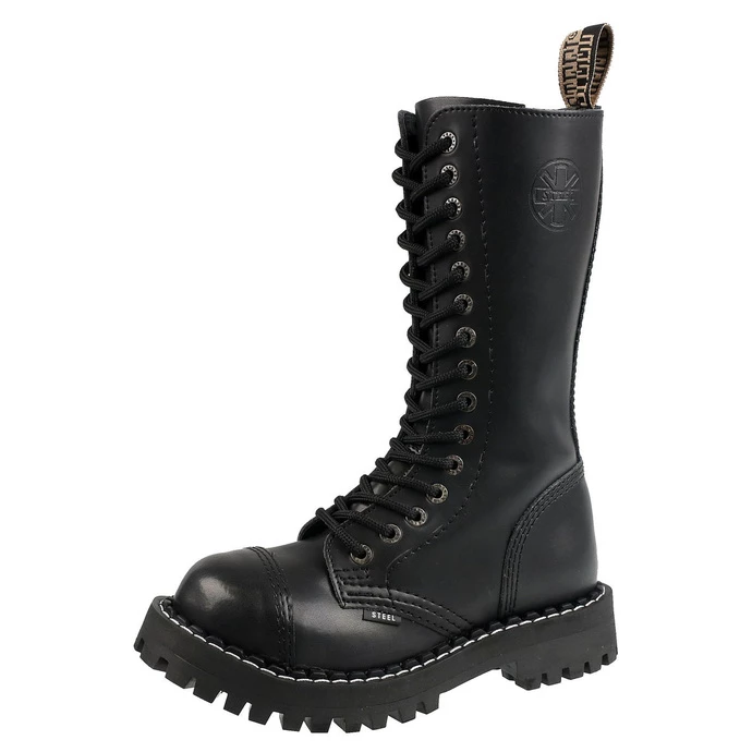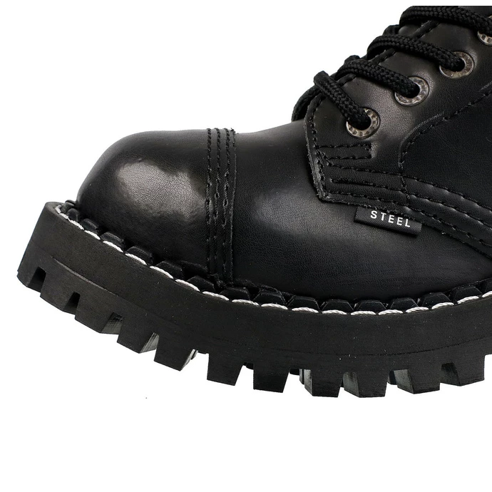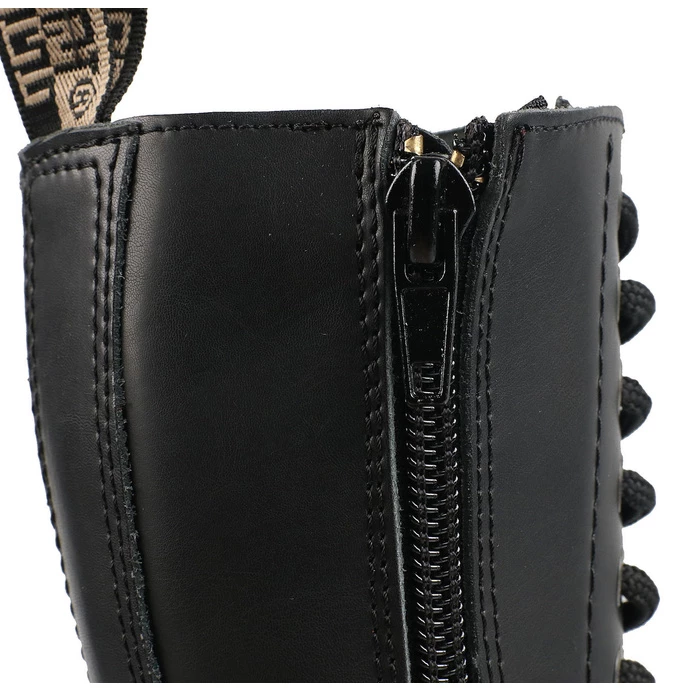 15-eye shoes made of real leather covered in black paint, by STEEL. Functional zipper on the side for easy dressing. Composition: genuine leather covered with paint, rubber outsole, metal tip. Steel reinforcement in the tips (toes protection). Shoe height approx. 31 cm. Heel height approx .: 3.7 cm. Color: black.