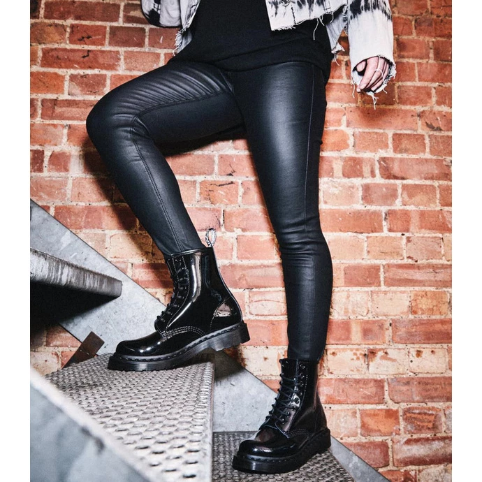 8-hole shoes by Dr. MARTENS made of genuine cowhide coated with paint. Shoes Dr. Martens thanks to their outstanding appearance, durability and tenacity, Martens have become worldwide icons in shoe industry. The inner tongue is tightly sewed to the shoe at the bottom – thanks to this, water, mud and small stones do not penetrate into the shoe. The sole is heat-sealed and sewed to the rest of the shoe, which has a positive effect on durability of the shoe. The sole is made after the model of the original Dr. shoes Martens – this air suspension in the sole has provided comfort and durability of the shoe since 1960. The sole is also resistant to oils and the tenacity of the rubber offers good mechanical resistance and anti-slip. Color: black – glossy. Quality leather shoes! Shoe height approx .: 19.5 cm. Heel height approx .: 3.5 cm. Composition: genuine cowhide, color, rubber sole. There is NO metal reinforcement in the toe of the shoe.
